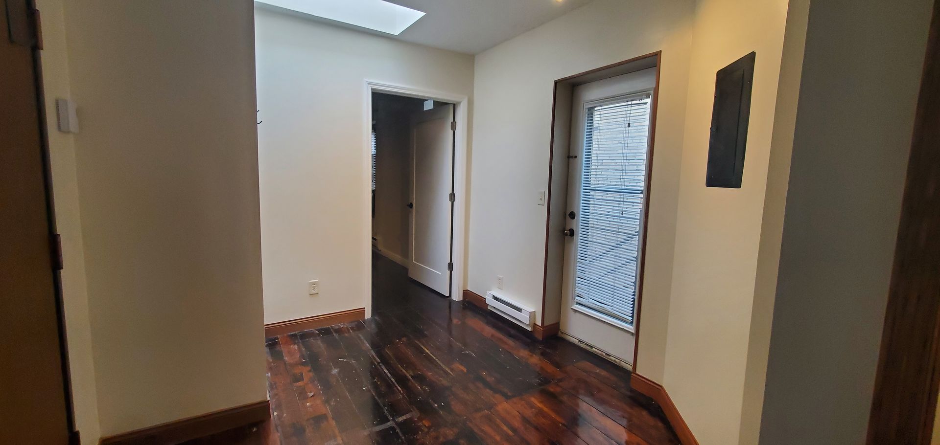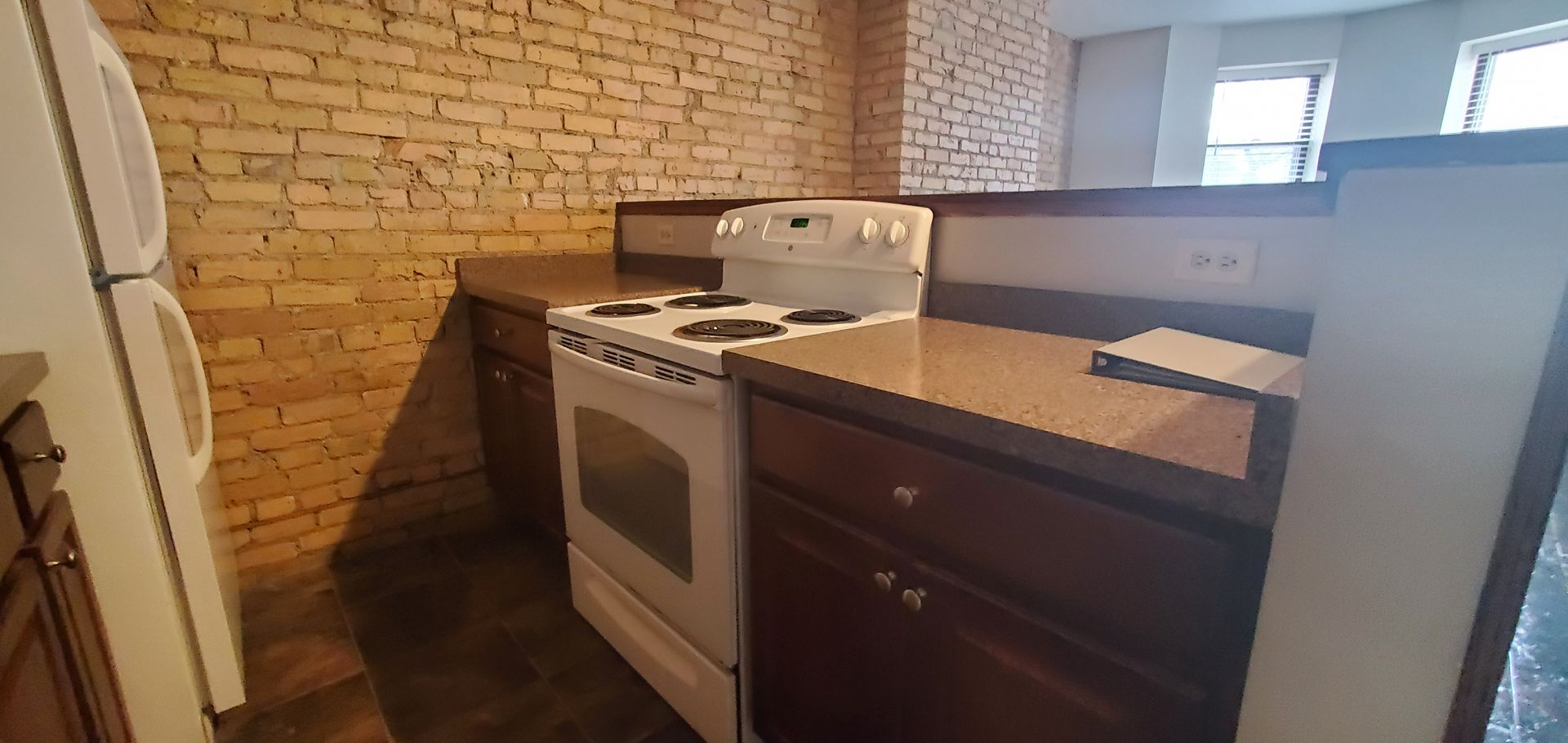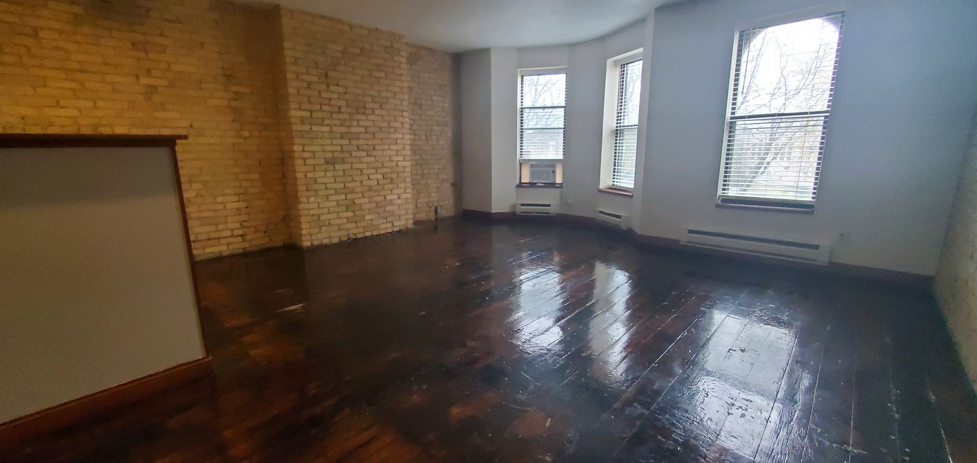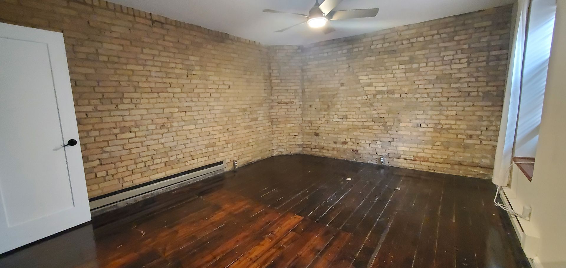 This apartment features exposed brick, wide plank wood floors, and updated kitchen and bath.