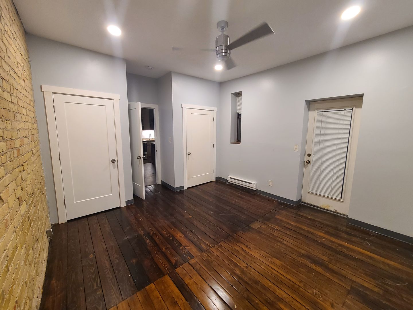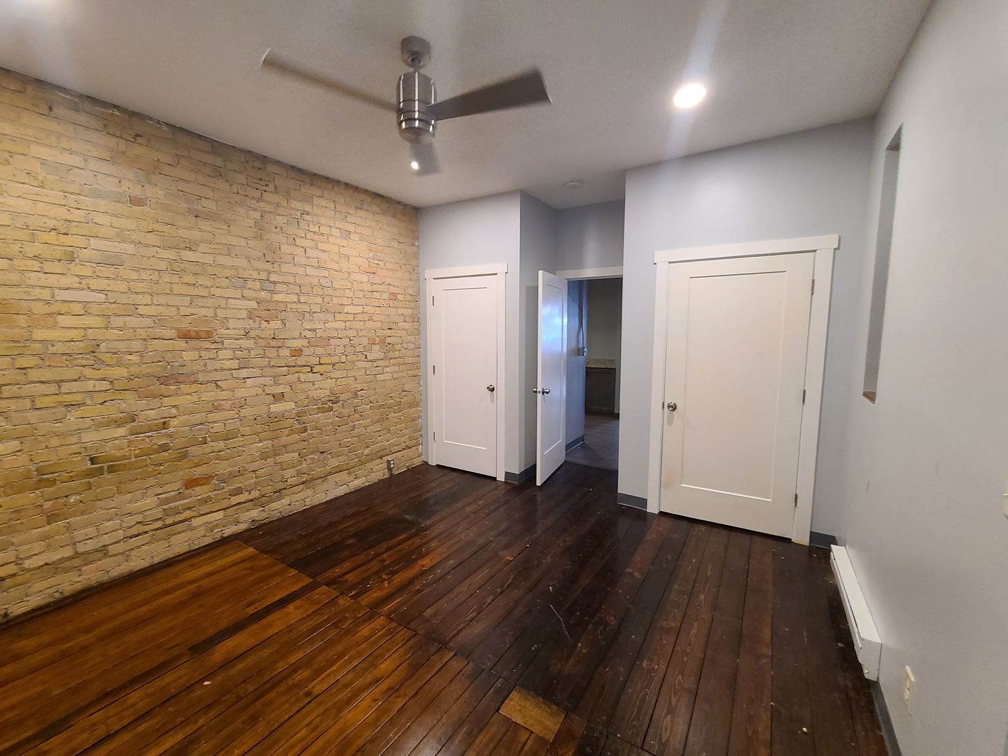 Each unit has exposed brick, hardwood floors, and a fenced outdoor patio area.